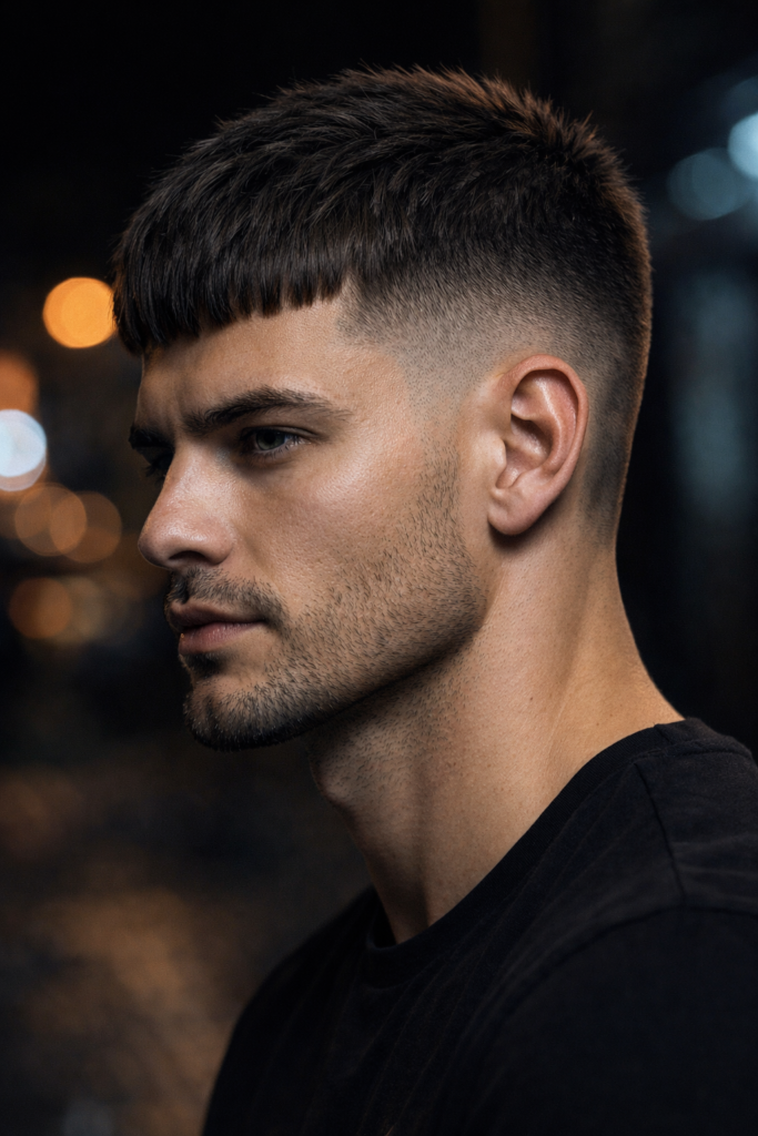 “I want a French crop with a burst fade. Keep the fade rounded around the ear, blend it into the neckline, and leave the top short with texture and a forward fringe.”