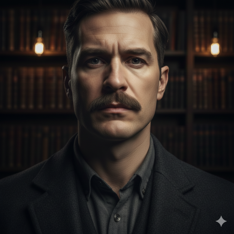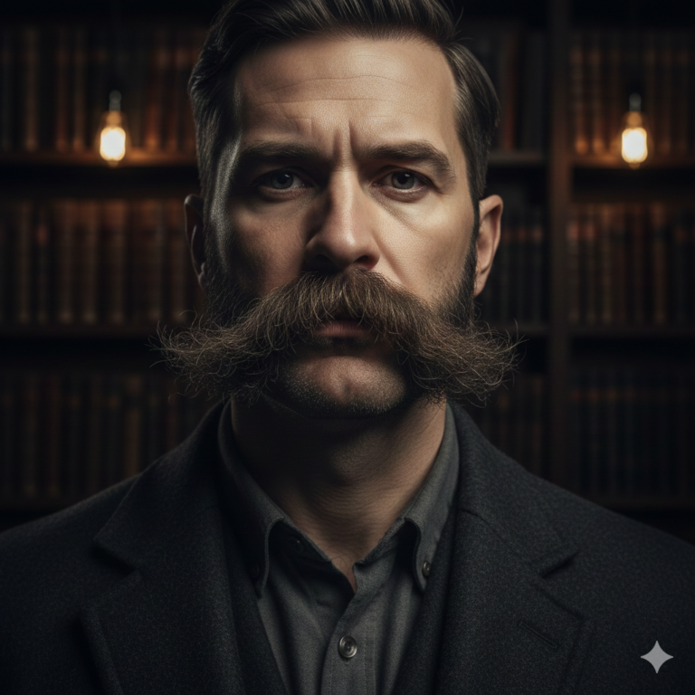 A Lampshade mustache is a rectangular, neatly trimmed mustache with clean vertical edges and a straight horizontal line above the lip. It resembles the shape of a lampshade — wider at the top, slightly narrow toward the lip, but always structured.
