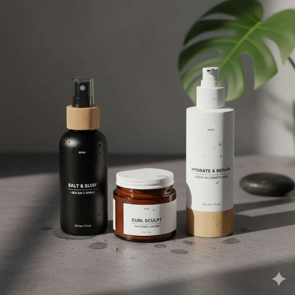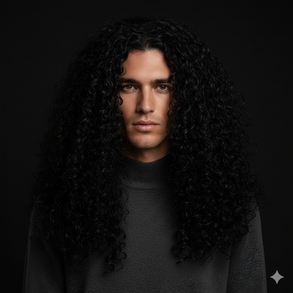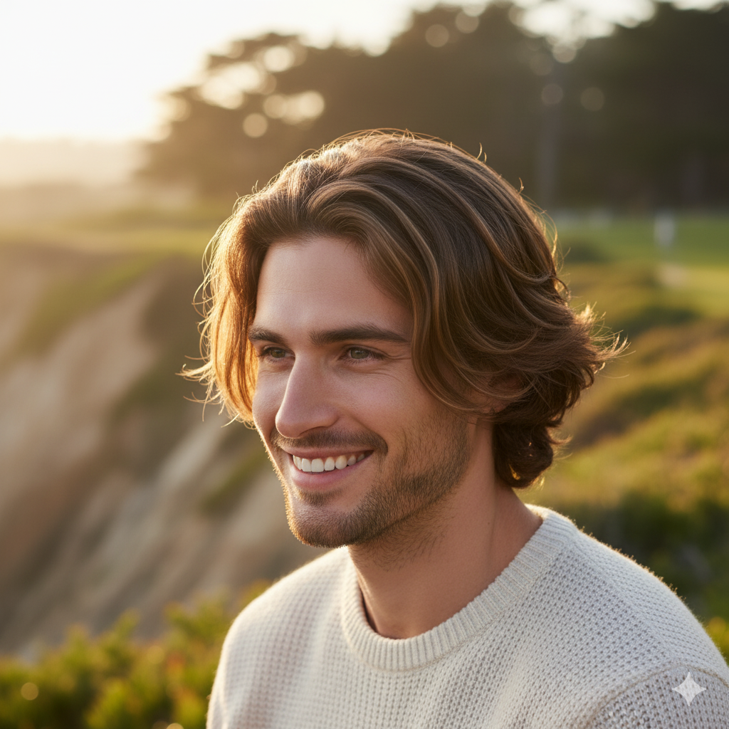 Hair falls naturally backwards with a soft wave, giving a modern surfer-meets-editorial vibe.